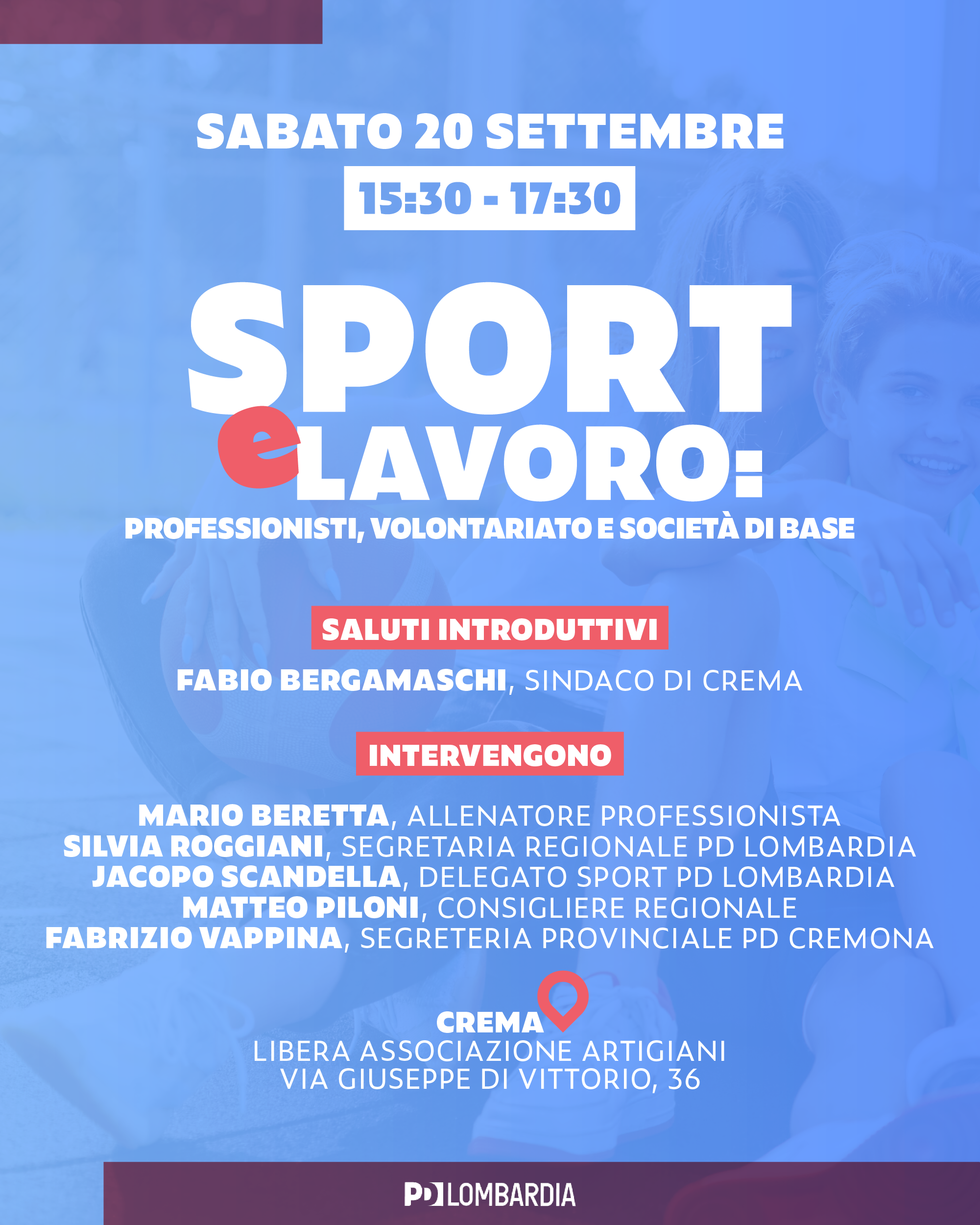 L’evento si terrà nel pomeriggio, dalle 15.30 alle 17.30 presso la sala convegni della Libera Associazione Artigiani e associazione Industriali, in via Giuseppe di Vittorio 36, nell’area Pip ex Olivetti. Interverranno la segretaria regionale Silvia Roggiani, i consiglieri regionali Jacopo Scandella, delegato per le politiche dello Sport del PD Lombardia, e Matteo Piloni, l’allenatore professionista Mario Beretta, allenatore professionista di calcio e docente della scuola allenatori FIGC di Coverciano e Fabrizio Vappina della segreteria provinciale del PD di Cremona. Porterà i saluti il sindaco della città Fabio Bergamaschi. Alle 17 la sala di Crema si collegherà con la sede nazionale del PD a Roma, da dove interverrà la segretaria nazionale Elly Schlein e quindi, per le conclusioni, il responsabile nazionale sport Mauro Berruto, già allenatore della nazionale maschile di volley.