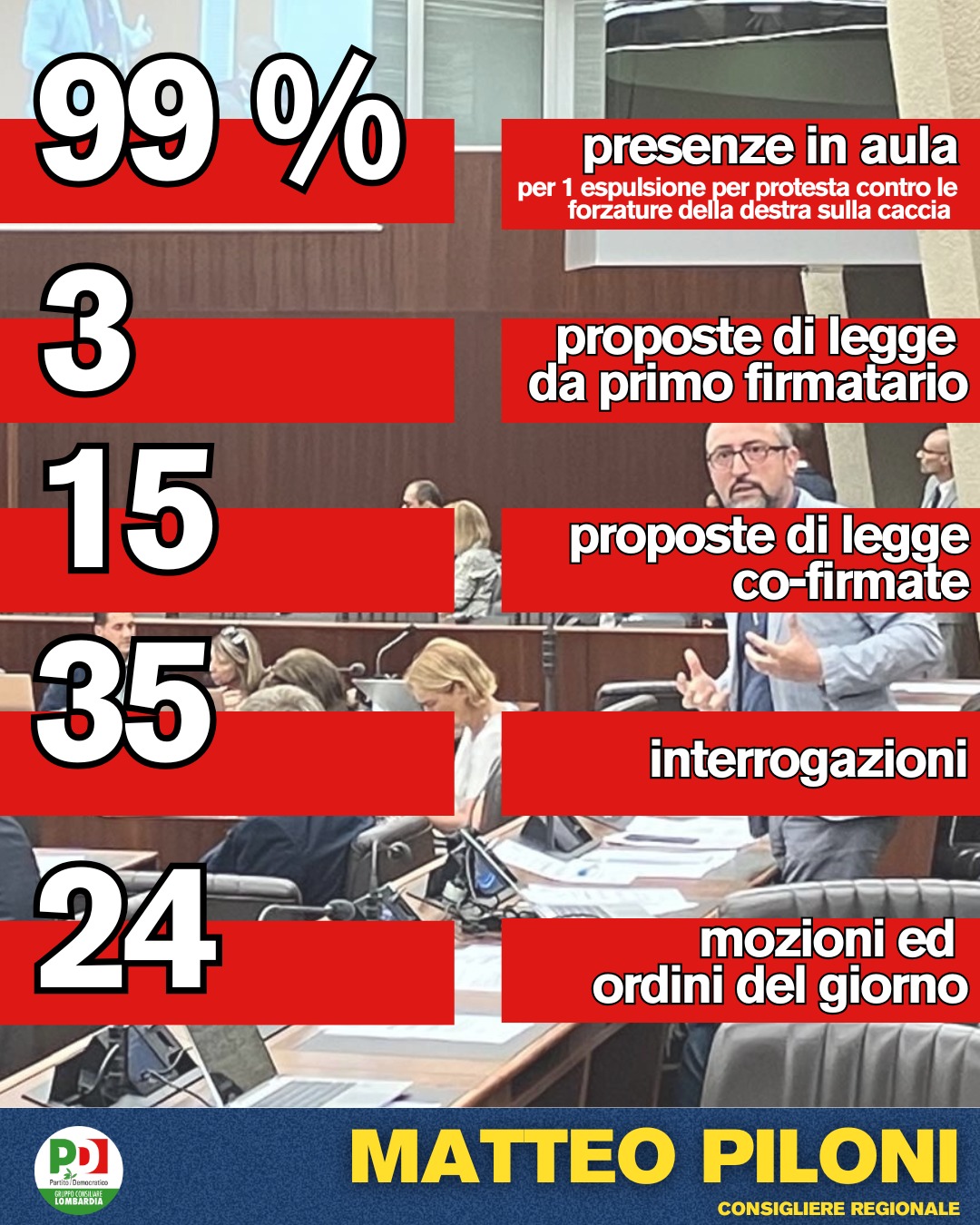 “Non tutto ciò che conta può essere contato, ma è comunque giusto raccontarlo”. Con queste parole, il consigliere regionale del Pd Matteo Piloni introduce, sulla sua pagina Facebook, il riepilogo numerico dell’attività svolta nel 2025 al Pirellone, con il 99% di presenze in aula, 3 proposte di legge come primo firmatario e altro 15 progetti di legge sottoscritti, 35 interrogazioni presentate e 24, tra mozioni e ordini del giorno.