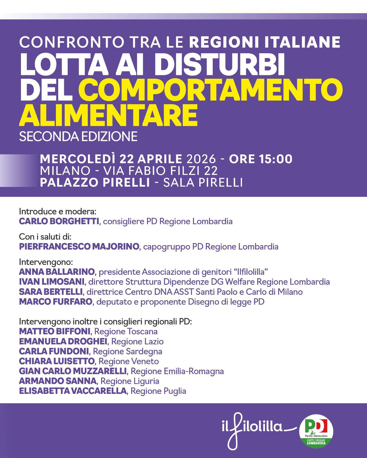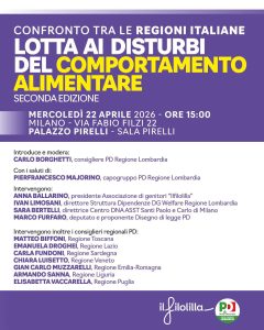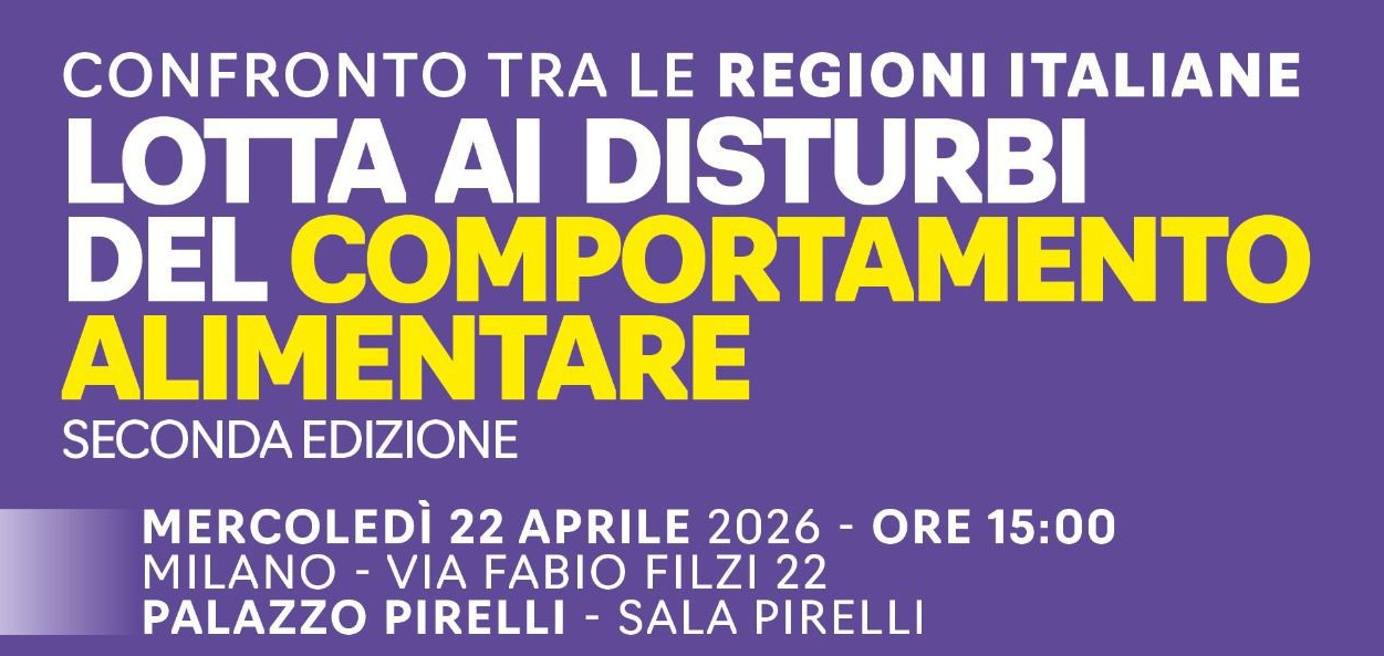 Domani, mercoledì 22 aprile, a partire dalle 15, in sala Pirelli, a Palazzo Pirelli, in via F. Filzi 22, a Milano, si terrà la seconda edizione dell’incontro “Lotta ai disturbi del comportamento alimentare – Confronto tra le regioni italiane”, organizzato dal Gruppo regionale del Pd.