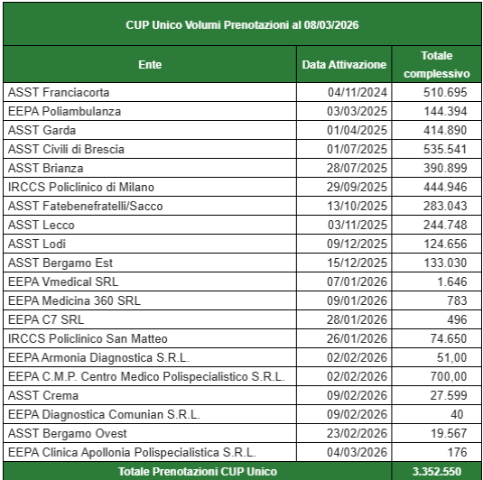 Nel frattempo le realtà pubbliche stanno lentamente entrando nel nuovo sistema, non senza difficoltà per cittadini e operatori: le Asst Franciacorta, Garda, Civili di Brescia, Brianza, Fatebenefratelli-Sacco, Lecco, Lodi, Bergamo Est, Crema e Bergamo Ovest, oltre agli Irccs Policlinico di Milano e Policlinico San Matteo di Pavia sono attivi nel nuovo Cup. Il problema è il privato.