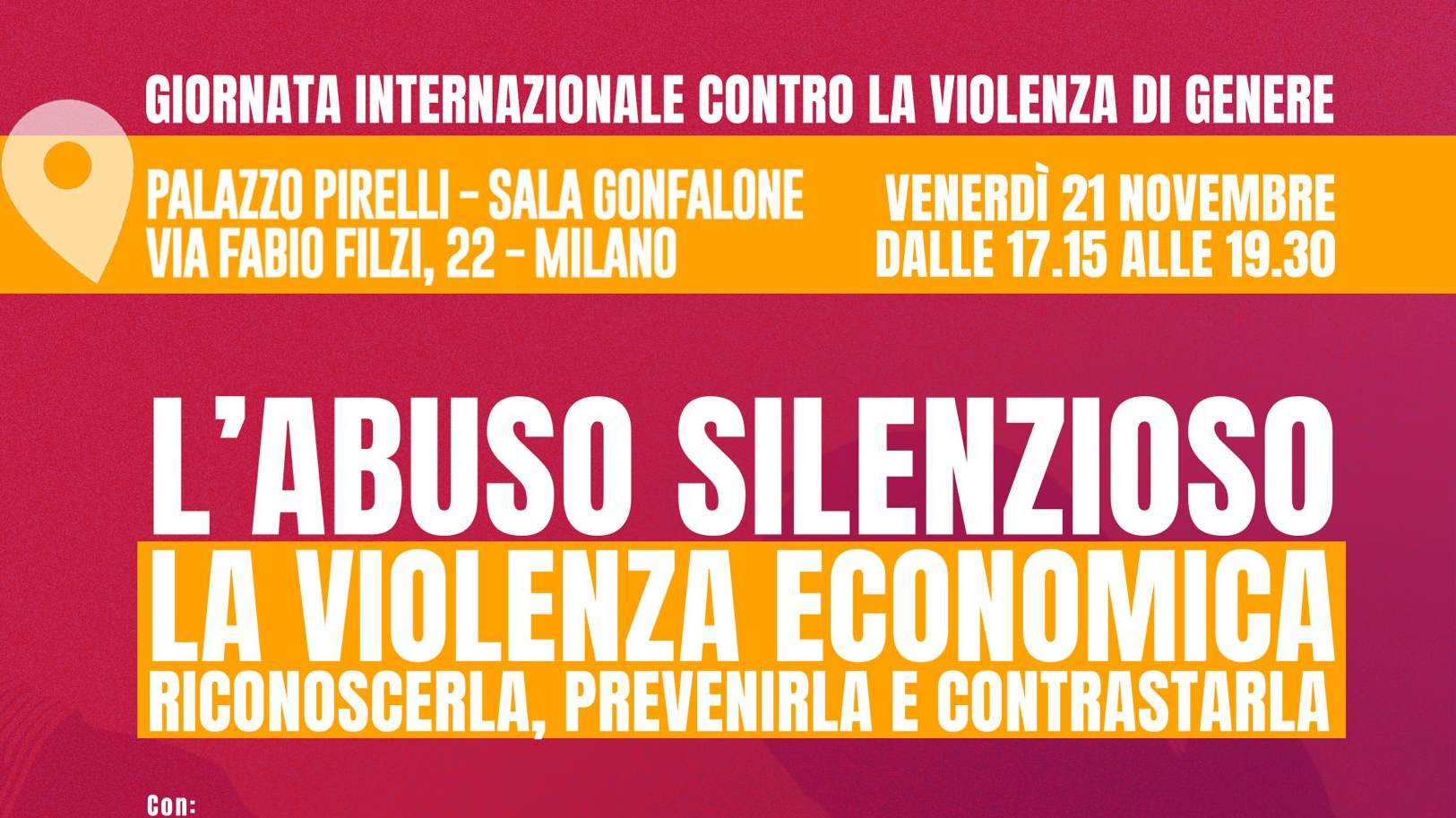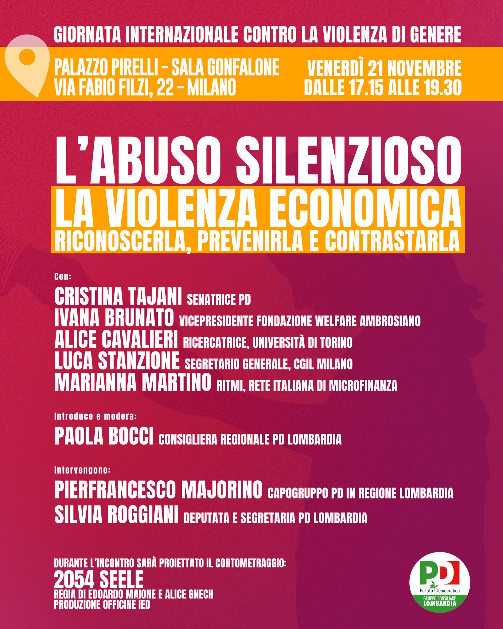 L’incontro si terrà domani, venerdì 21 novembre 2025, dalle 17.15 alle 19.30, in sala Gonfalone, a Palazzo Pirelli, in via F. Filzi 22, a Milano, e avrà come titolo “L’abuso silenzioso – La violenza economica: riconoscerla, prevenirla e contrastarla”.